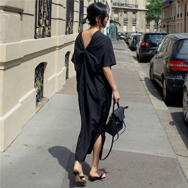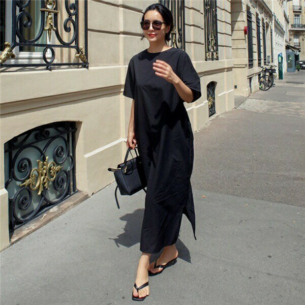 【期間限定!マスクプレゼント中】レディース 韓国風 ワンピース ロング ラウンドネック ブラック ゆったり クルーネック マキシ レディース ワンピ ロング マキシ 半袖 大きいサイズ 綿 マキシ マキシ丈 半袖 カジュアル S/M/L/XL dn097l6l6d4