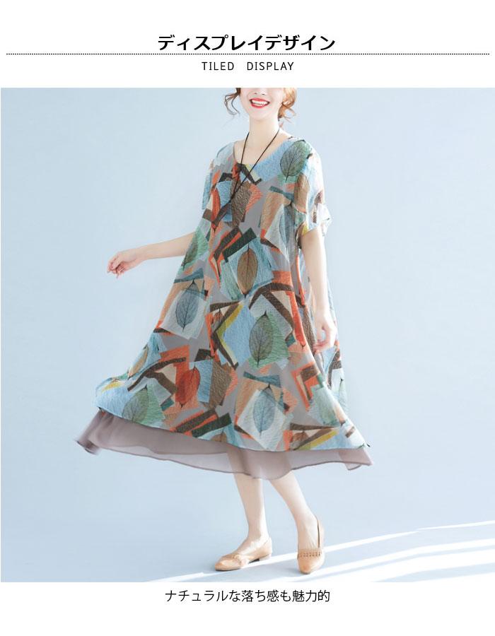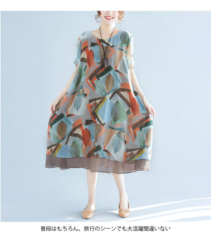 【送料無料】シフォンワンピース レディース 大きいサイズ ロングワンピース ミモレワンピース 半袖 ラウンドネック 花柄 薄手 シフォン 裏地付き お洒落 レトロ リゾート ふんわり 体型カバー 夏新作