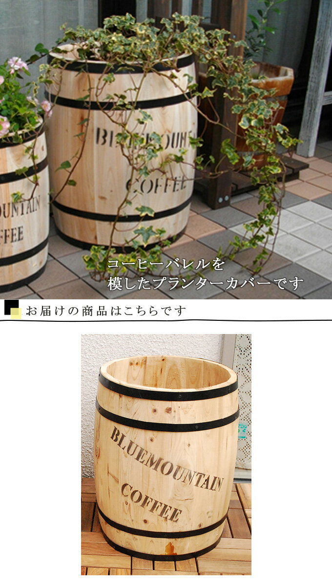 コーヒー樽水抜き穴があり、プランターとしても使用できるコーヒーバレルを模したプランターカバーです。