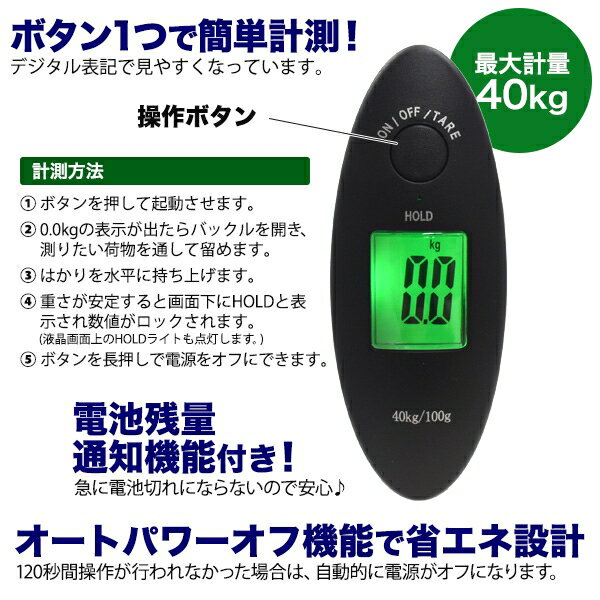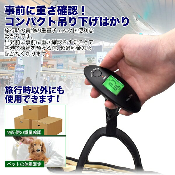 【搭乗時や旅行先で活躍 デジタル式コンパクト吊り下げはかり】広告文責(有)イースクエアTEL:0120-532-772サイズ(約) 縦13×横10cm重量(約) 50g表示可能単位 kg、lb電源 ボタン電池:CR2032(テスト用電池付属)測定可能重量 0.1kg〜40kg中国製※海外からの輸入品となります。